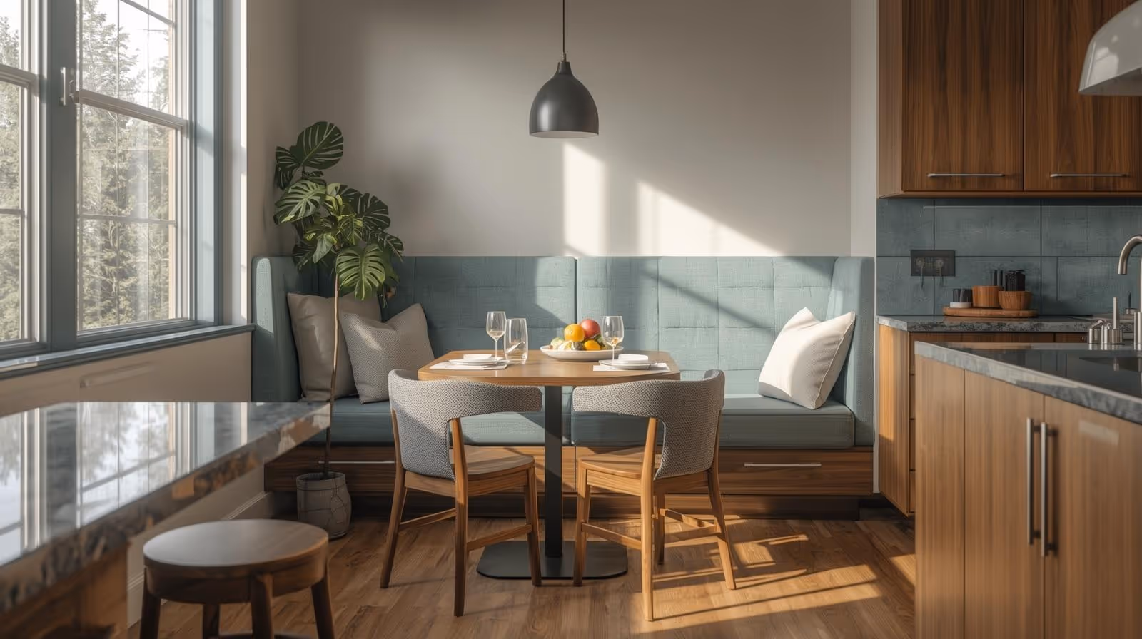 Add a cozy bench seating nook for casual dining. Innovative countersplash materials like tempered glass can offer both functionality and style.