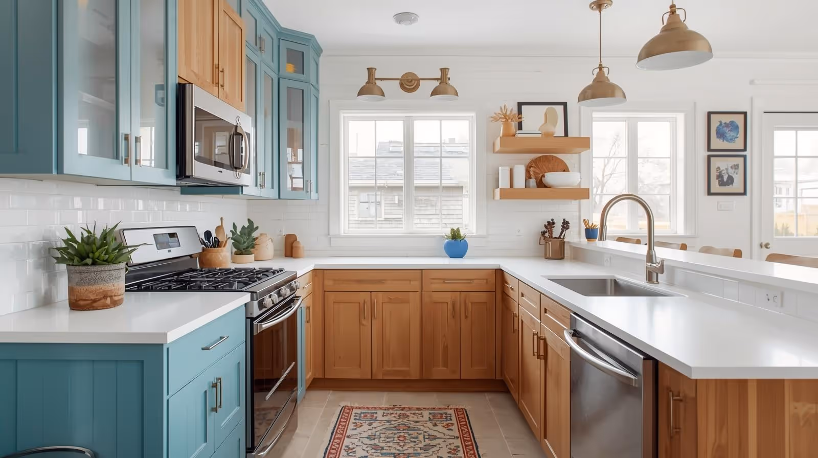 Artwork and decorative rugs can add a touch of personality and color, making the kitchen feel more like a living space.